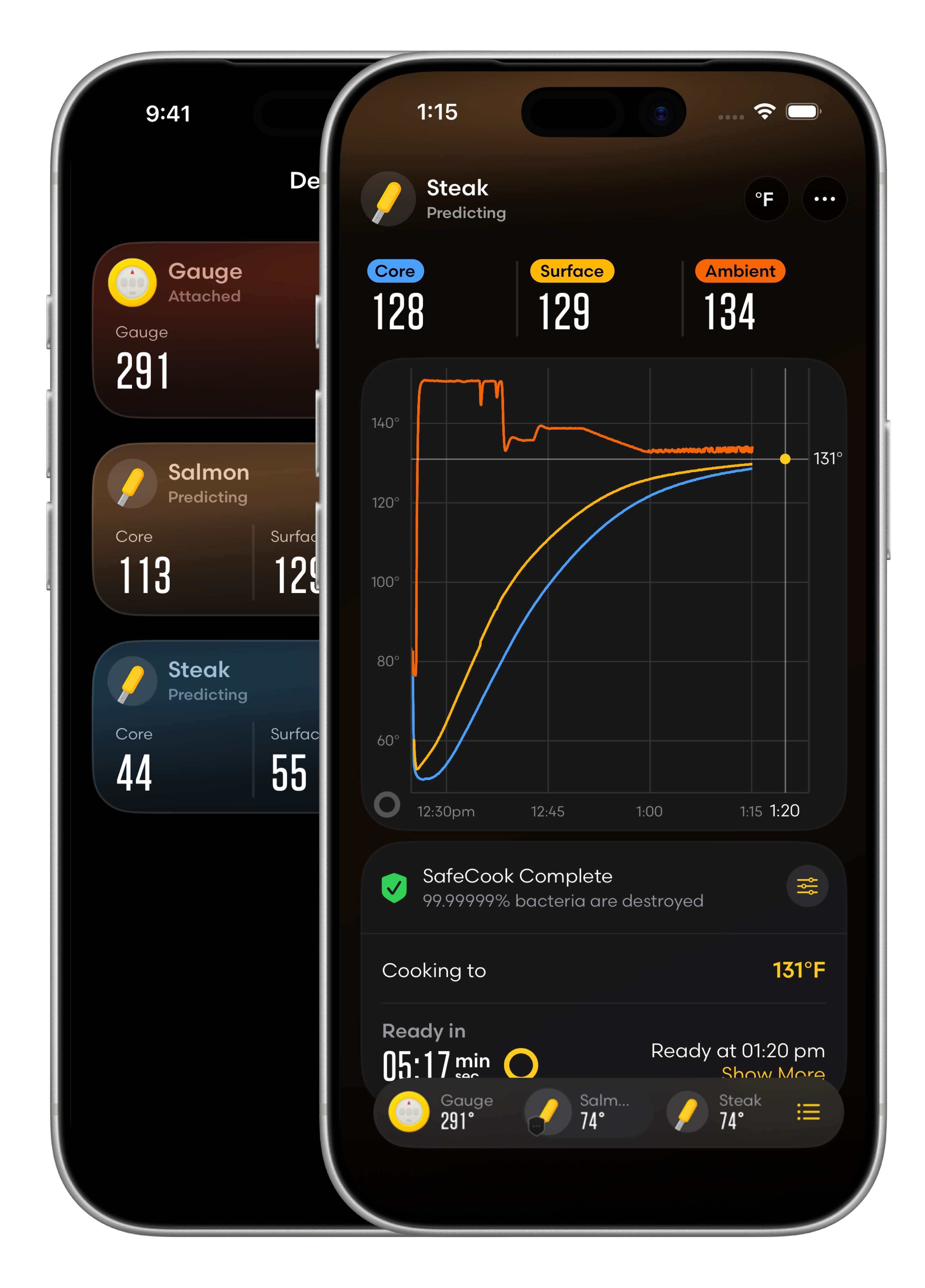 Keep your food safe and delicious!SafeCook™ tracks time at temps and tells you exactly when your food is safe to eat. No need to overcook “just to be sure.”